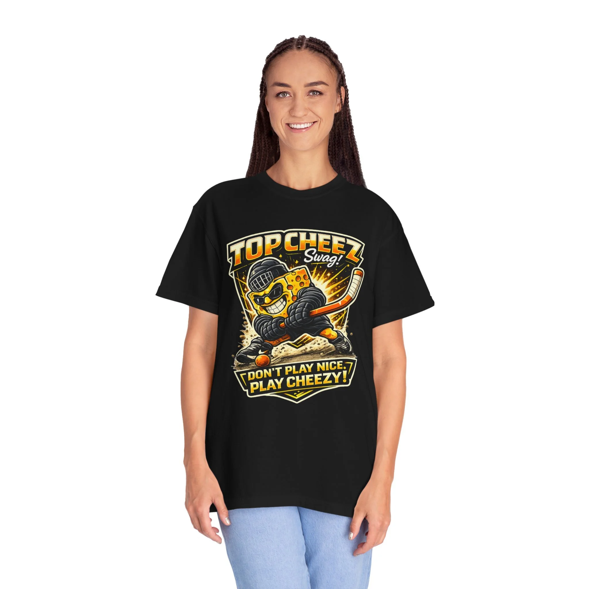 The “Don't Play Nice. Play Cheezy!” Cheesy Mascot Tee brings confident energy to everyday streetwear. Made from heavyweight garment-dyed cotton, the fabric feels soft and broken-in from the start while holding a structured, relaxed fit built for all-day wear. The front features the bold TOP CHEEZ mascot graphic paired with graffiti-inspired lettering that captures the playful swagger of street and rink culture.